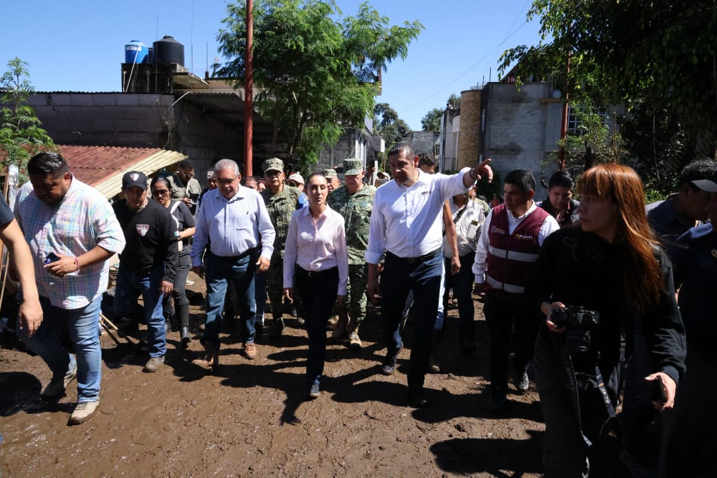 «Estamos con ustedes y sepan que no vamos a dejar a nadie desamparado», aseguró la presidenta de México, Claudia Sheinbaum, durante su visita a los municipios afectados por las intensas lluvias que se registraron en la Sierra Norte. La titular del ejecutivo federal estuvo acompañada por el gobernador de Puebla, Alejandro Armenta, como parte de la atención inmediata ante la emergencia y de constatar de manera directa la magnitud de los daños, identificar zonas de difícil acceso y dar continuidad a la coordinación de los esfuerzos de auxilio y recuperación en beneficio de las familias damnificadas.